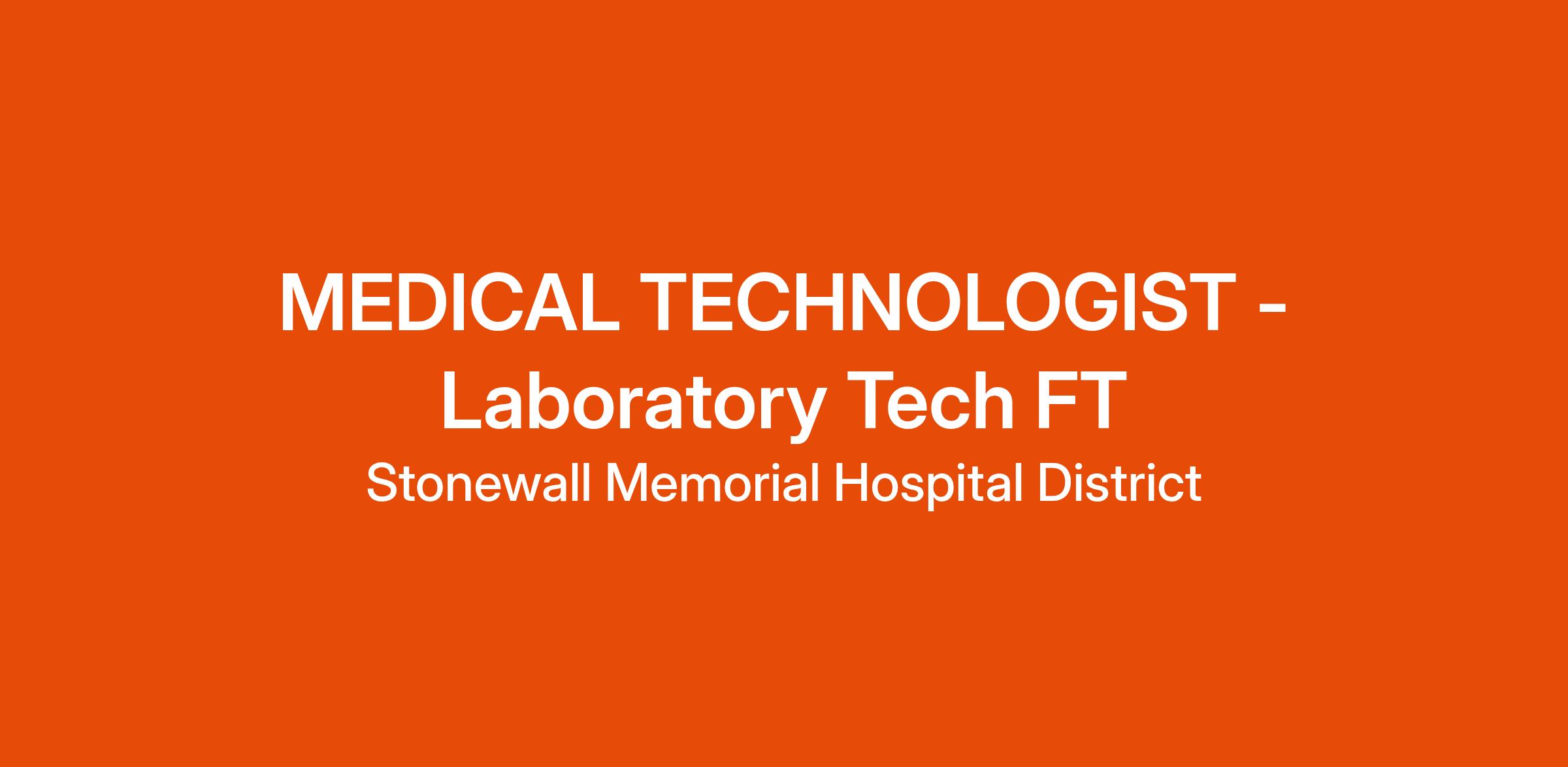 Stonewall Memorial Hospital District is looking for a Medical Technologist to join our team. This is a full-time position with various shifts —hours and competitive wages will be discussed during the interview.